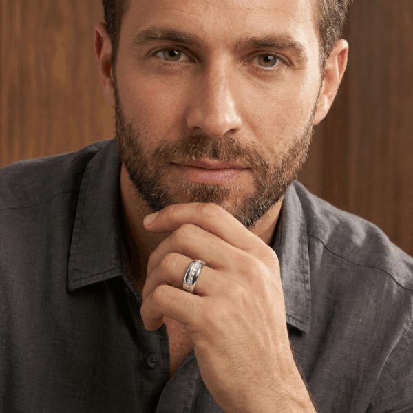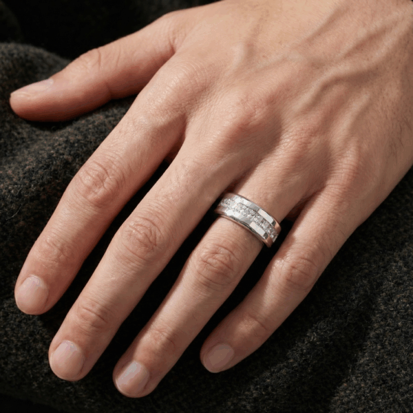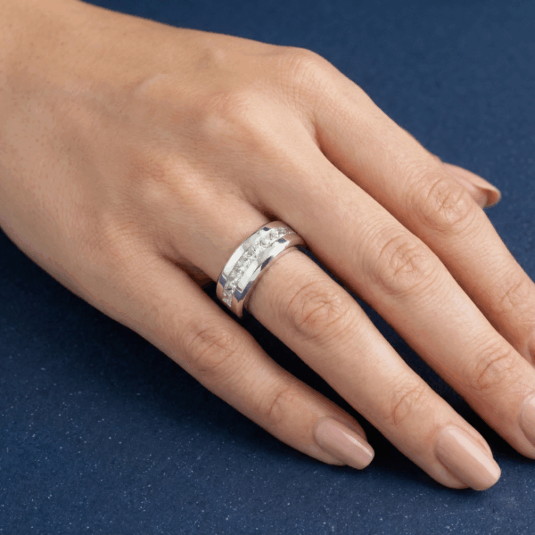 Đây là một mẫu nhẫn cực kỳ ấn tượng bởi đính tới 9 viên đá dạng Princess trên nhẫn. Thiết kế của nhẫn phù hợp cho cả nam và nữ, nó kết hợp giữa phong cách mạnh mẽ và vẻ đẹp tinh tế.