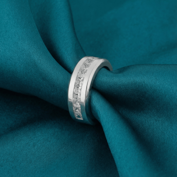 Được chế tác từ bạc 925 sau đó được xi phủ nhiều lớp, sản phẩm mang lại độ bền vượt trội, chống xỉn màu và an toàn cho mọi loại da, kể cả da nhạy cảm. Thiết kế nhẫn với vành rộng, được đính một hàng đá cubic zirconia lấp lánh chạy dọc giữa thân nhẫn, tạo hiệu ứng ánh sáng rực rỡ, phù hợp để tôn lên phong cách cá nhân trong mọi dịp.