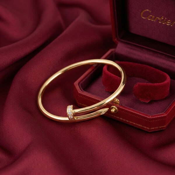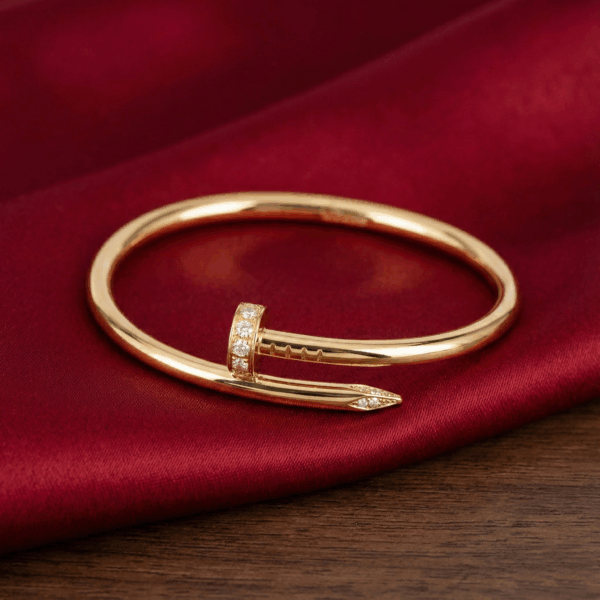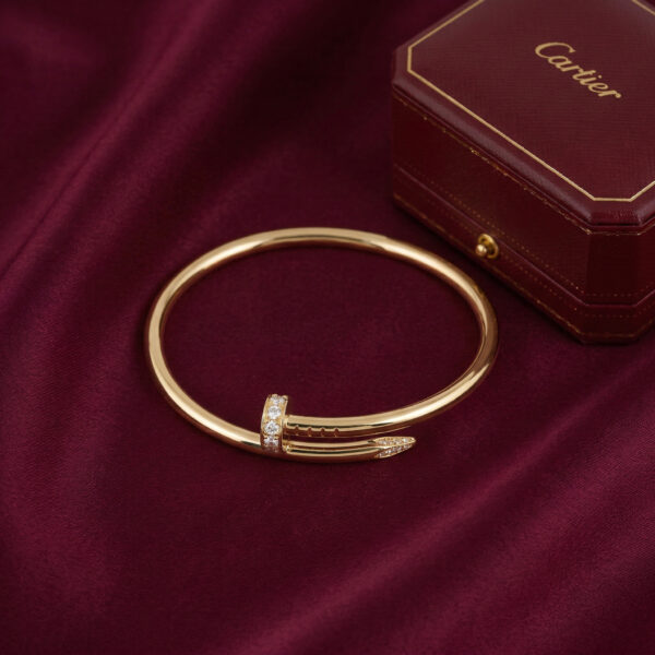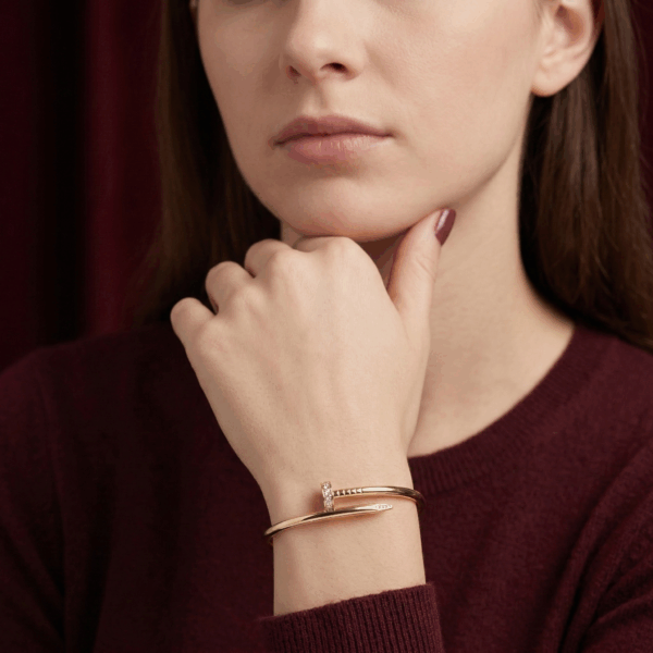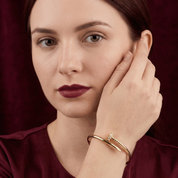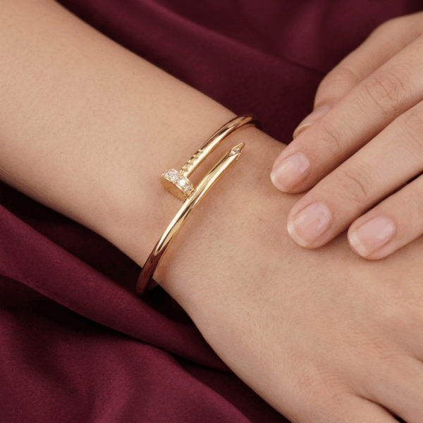 Chiếc lắc tay được thiết kế dựa trên biểu tượng đinh bọc xoắn trứ danh của Cartier, mang vẻ đẹp độc đáo và táo bạo nhưng vẫn đầy thanh lịch. Phần đầu đinh được đính những viên đá Cubic Zirconia lấp lánh, tạo điểm nhấn sang trọng và thu hút ánh nhìn ở mọi góc độ.