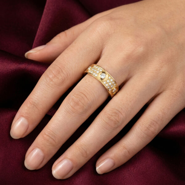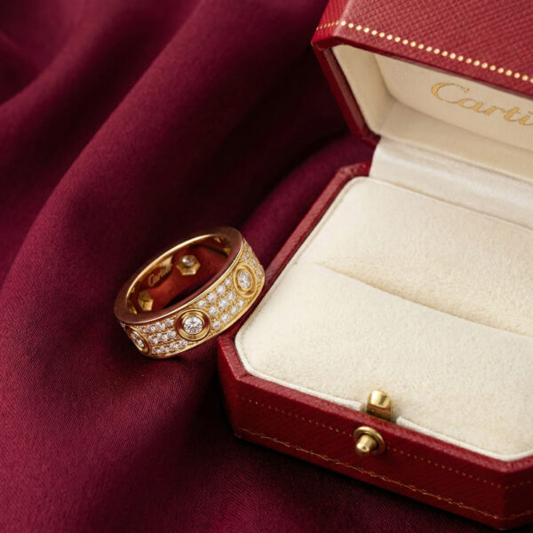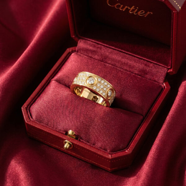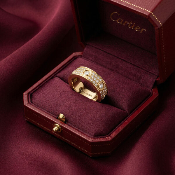 Chiếc nhẫn Cartier’s, LOVE Ring Pavé Stone, Gold Filled này là sự kết hợp hoàn hảo giữa thiết kế táo bạo và sự sang trọng vượt thời gian.The screw motifs, ideal oval shape and undeniable elegance establish the piece as a timeless tribute to passionate romance.