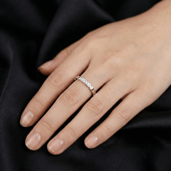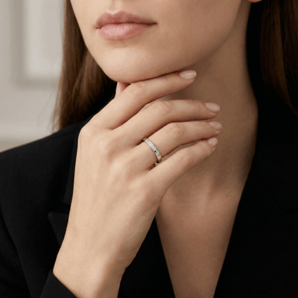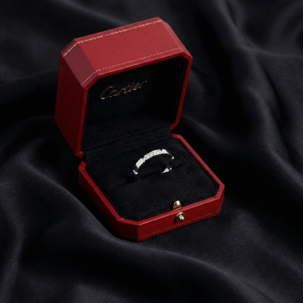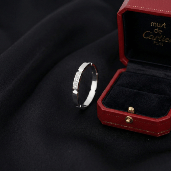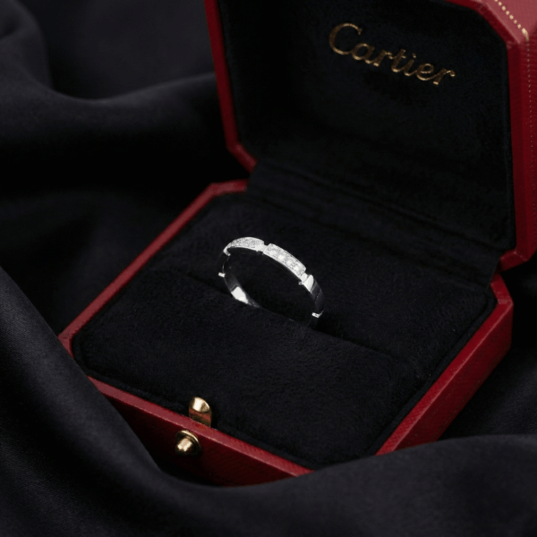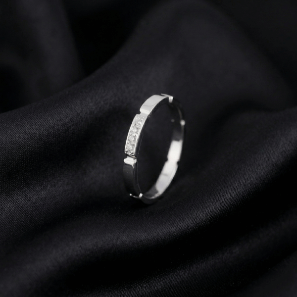 Chiếc nhẫn 4 stone Maillon tới từ thương hiệu Cartier’s mang đậm hơi thở hiện đại với thiết kế thân nhẫn dạng khối vuông mạnh mẽ, tạo cảm giác chắc chắn và thời thượng. Điểm nhấn là dải đá lấp lánh được đính tinh tế ở trung tâm. Màu trắng của bạc kết hợp với ánh sáng rực rỡ từ đá cubic zirconia khiến chiếc nhẫn trở thành lựa chọn lý tưởng cho những ai yêu thích phong cách tối giản nhưng vẫn nổi bật.