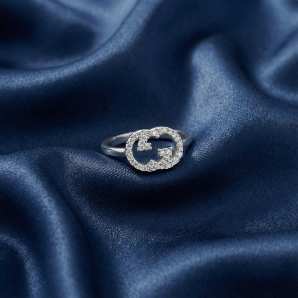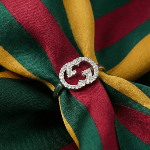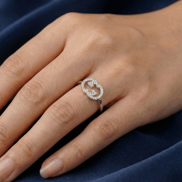 Chiếc nhẫn này nằm trong bộ sưu tập trang sức Interlocking lấy cảm hứng từ logo hình học. Điểm nhấn của thiết kế là biểu tượng chữ “G” đan xen cách điệu, được đính kín bởi những viên đá cubic zirconia nhỏ lấp lánh theo kiểu pavé, tạo nên một vòng tròn ánh sáng rực rỡ, vừa thanh lịch vừa nổi bật.