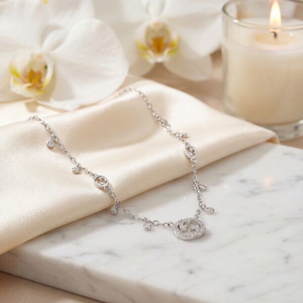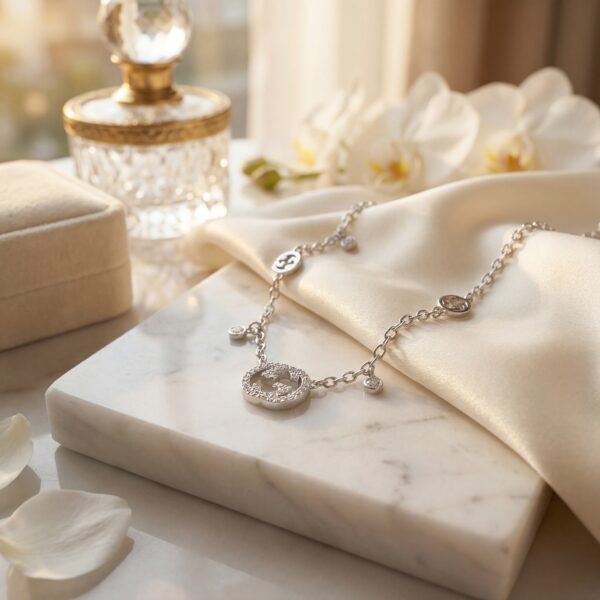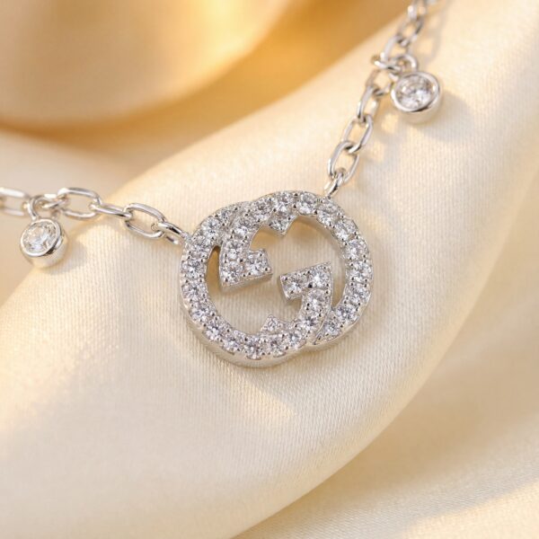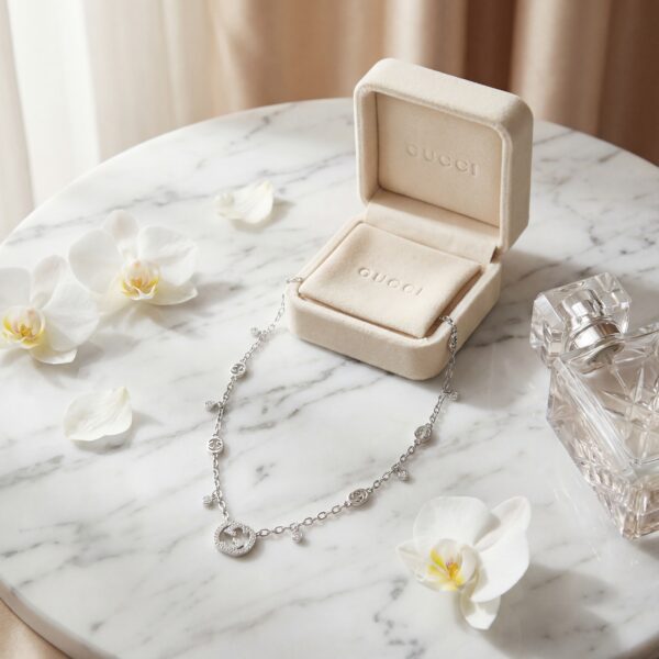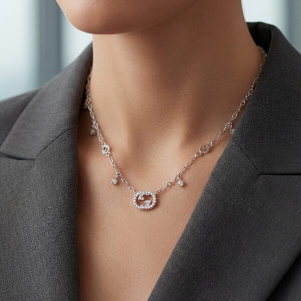 Dây chuyền Gucci này là hiện thân của sự sang trọng và tinh tế, mang đậm dấu ấn thương hiệu với thiết kế logo GG biểu tượng. Mặt dây chuyền hình oval được đính đá cubic zirconia lấp lánh, bao quanh logo GG, tạo nên vẻ đẹp rực rỡ và cuốn hút. Dây chuyền bạc mảnh mai, điểm xuyết bởi các chi tiết nhỏ hình logo GG và đá quý, mang lại sự hài hòa giữa sự tối giản và phong cách xa xỉ, phù hợp với mọi dịp từ hàng ngày đến các sự kiện quan trọng….