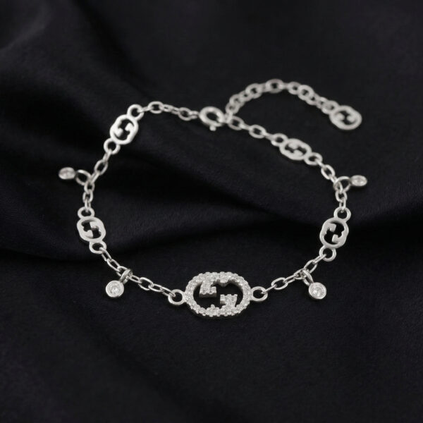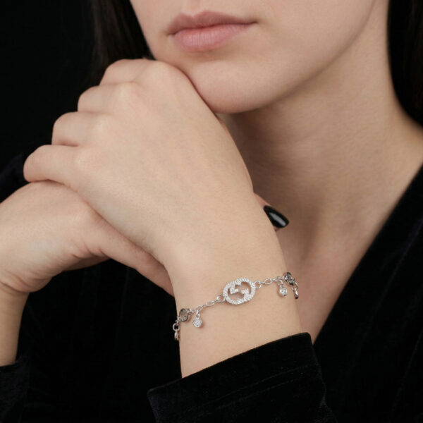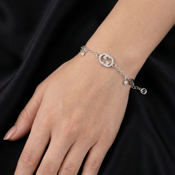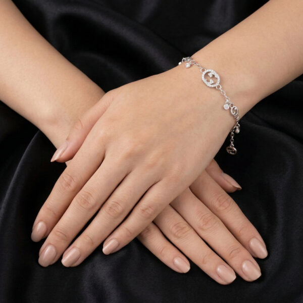 Chất liệu bạc 925 không chỉ giúp sản phẩm luôn sáng bóng, bền đẹp theo thời gian mà còn an toàn tuyệt đối cho da, kể cả làn da nhạy cảm. Chỉ khi bạn đeo các chất liệu kim loại rẻ tiền thì sẽ khiến tay bạn dễ bị kích ứng, ngứa hoặc mẩn đỏ. Dọc thân lắc là những họa tiết GG tròn xen kẽ cùng đá đính rơi nhẹ, tạo hiệu ứng ánh sáng tinh tế khi đeo.
