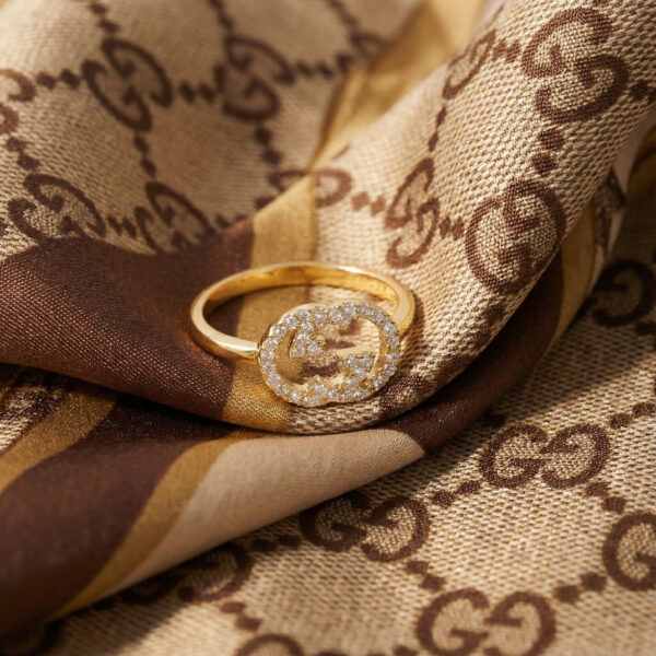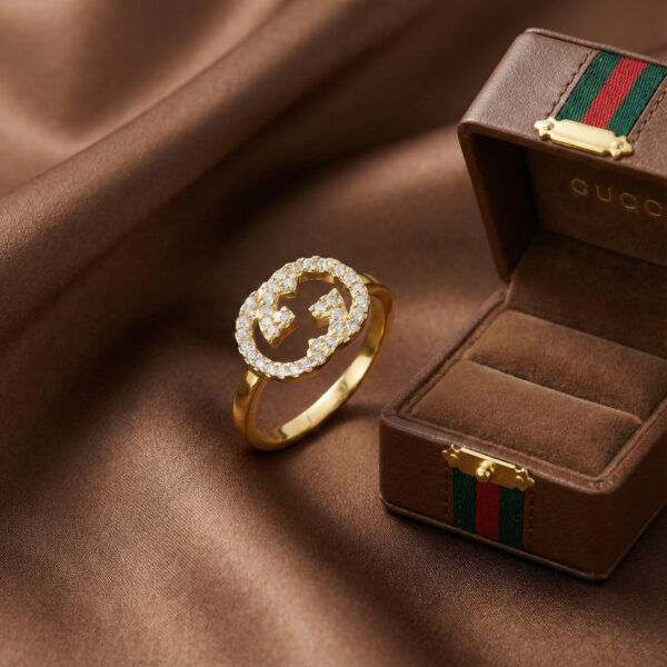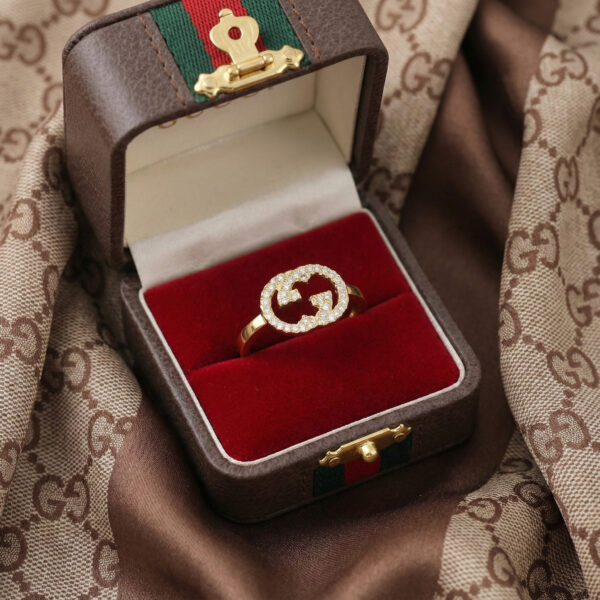 Chiếc nhẫn này nằm trong bộ sưu tập trang sức Interlocking lấy cảm hứng từ logo hình học. Điểm nhấn của thiết kế là biểu tượng chữ “G” đan xen cách điệu, được đính kín bởi những viên đá cubic zirconia nhỏ lấp lánh theo kiểu pavé, tạo nên một vòng tròn ánh sáng rực rỡ, vừa thanh lịch vừa nổi bật.