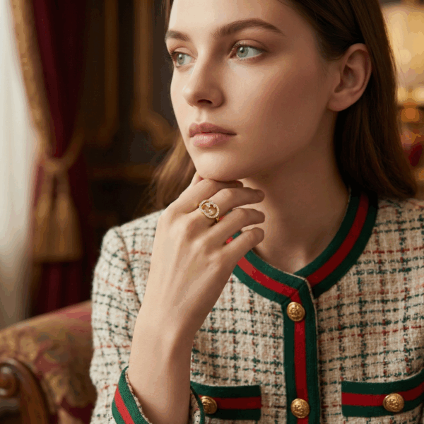 Chiếc nhẫn này nằm trong bộ sưu tập trang sức Interlocking lấy cảm hứng từ logo hình học. Điểm nhấn của thiết kế là biểu tượng chữ “G” đan xen cách điệu, được đính kín bởi những viên đá cubic zirconia nhỏ lấp lánh theo kiểu pavé, tạo nên một vòng tròn ánh sáng rực rỡ, vừa thanh lịch vừa nổi bật……