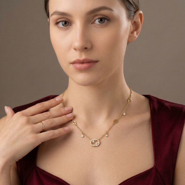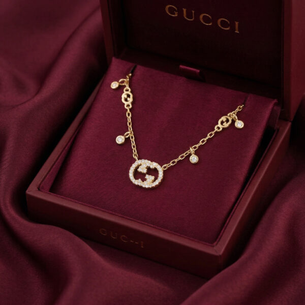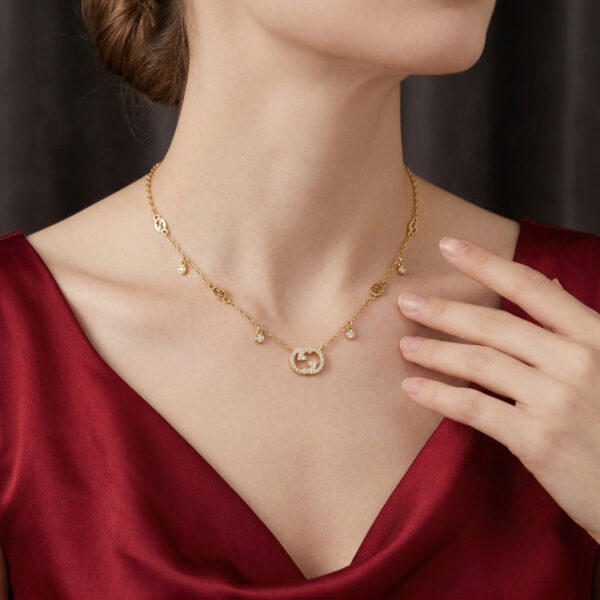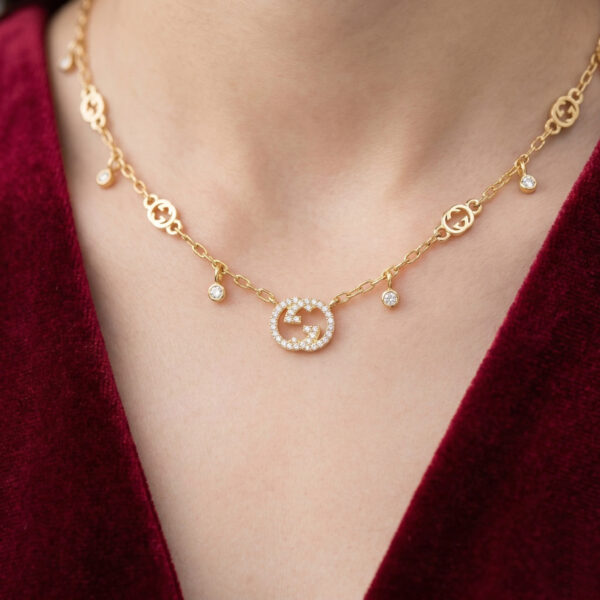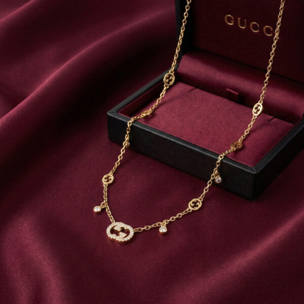 Dây chuyền Gucci này là hiện thân của sự sang trọng và tinh tế, mang đậm dấu ấn thương hiệu với thiết kế logo GG biểu tượng. Mặt dây chuyền hình oval được đính đá cubic zirconia lấp lánh, bao quanh logo GG, tạo nên vẻ đẹp rực rỡ và cuốn hút. Dây chuyền bạc mảnh mai, điểm xuyết bởi các chi tiết nhỏ hình logo GG và đá quý, mang lại sự hài hòa giữa sự tối giản và phong cách xa xỉ, phù hợp với mọi dịp từ hàng ngày đến các sự kiện quan trọng.