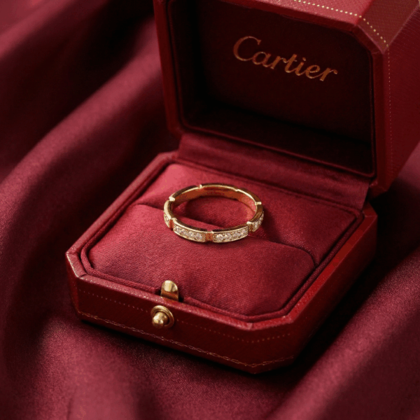 Chiếc nhẫn Half-paved Maillon này mang đậm hơi thở hiện đại với thiết kế thân nhẫn dạng khối vuông mạnh mẽ, tạo cảm giác chắc chắn và thời thượng.