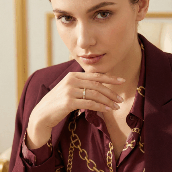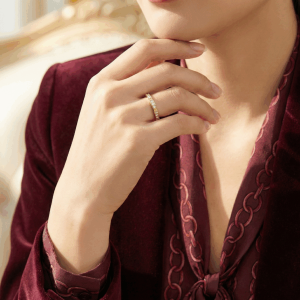 The half-pavé design makes it perfect for everyday wear. It’s not loud, but it absolutely looks expensive and high-end.