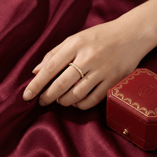 Tặng bạn gái mà cô ấy tưởng mình chơi lớn đặt từ Cartier thật. Mắt xích mềm mại, đá sáng tự nhiên. Form nhẫn ôm tay, logo khắc trong rõ nét y như chính hãng.