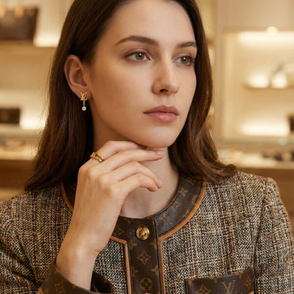 Một thiết kế thanh lịch và đầy cuốn hút từ cảm hứng thời trang hàng hiệu, mẫu khuyên tai này nổi bật với biểu tượng L.V cách điệu sắc nét, kết hợp với viên đá Cubic Zirconia lấp lánh được treo khéo léo tạo chuyển động nhẹ nhàng theo từng bước đi.