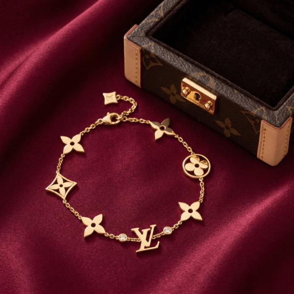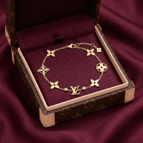 Chiếc lắc tay đến từ thương hiệu L.V nổi bật với thiết kế tinh xảo, kết hợp giữa biểu tượng L.V đặc trưng cùng các hoạ tiết bông hoa Monogram – những chi tiết mang tính biểu tượng, đậm chất thời trang Pháp và đẳng cấp vượt thời gian.