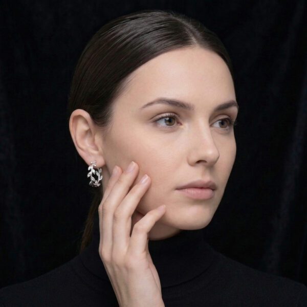 Từng chi tiết lá được gia công tỉ mỉ, mang đến cảm giác sống động như những cành lá thật, vừa nhẹ nhàng vừa nổi bật. Đôi khuyên tai có kích thước vừa phải, không quá lớn, đảm bảo sự thoải mái khi đeo trong thời gian dài.