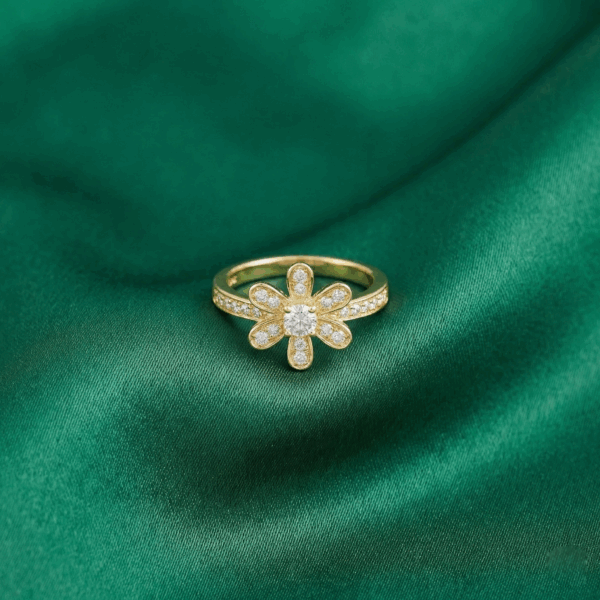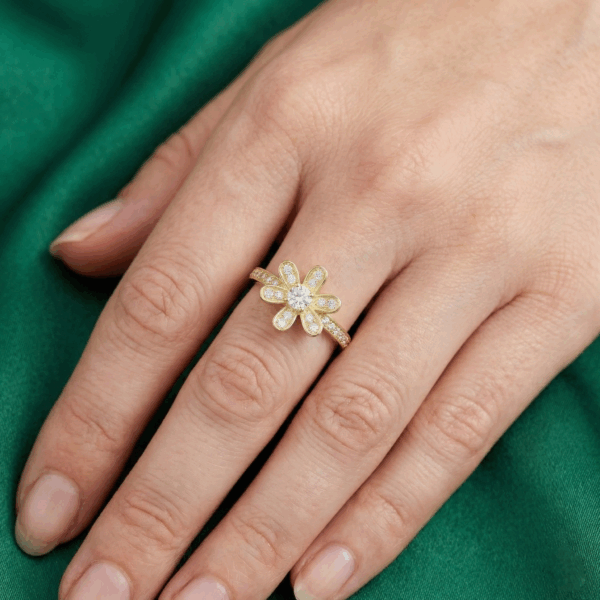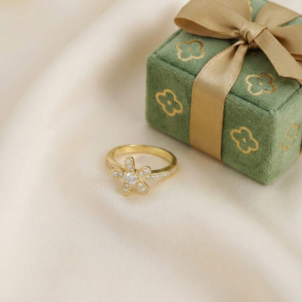 Mặt chính của nhẫn được thiết kế hình bông hoa đính full đá nên tạo hiệu ứng ánh sáng lung linh, tựa như bông hoa nở rộ dưới ánh nắng. Khi đeo chiếc nhẫn này lên tạo cảm giác rất tươi mát và nhẹ nhàng. Thân nhẫn mảnh mai, được trang trí thêm dải đá chạy dọc, ôm khít ngón tay với sự thoải mái và nhẹ nhàng, phù hợp để đeo hàng ngày hoặc làm điểm nhấn cho những dịp đặc biệt.