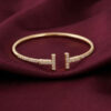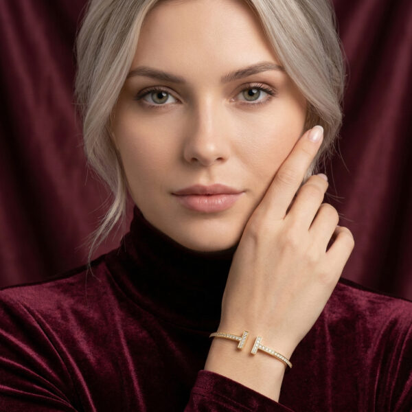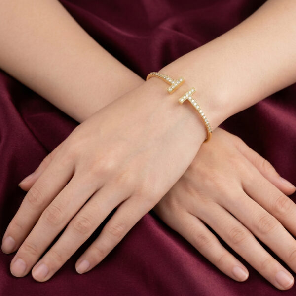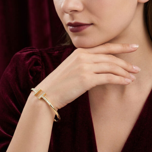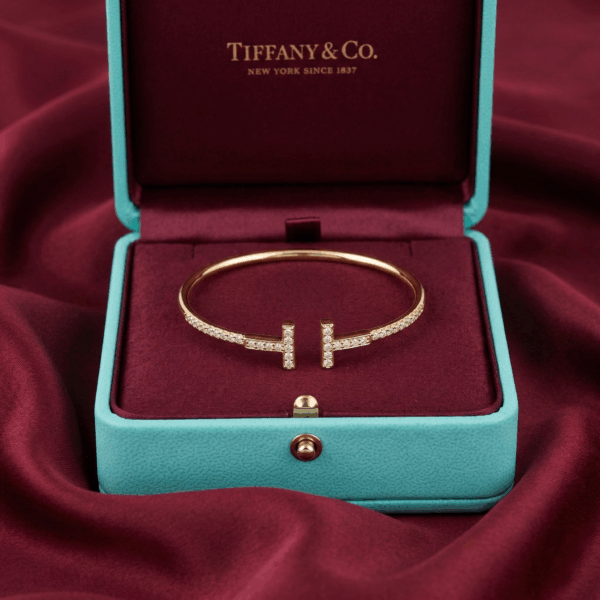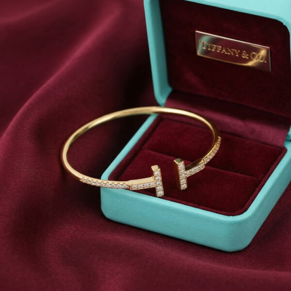 Chiếc lắc tay đến từ Tiffany & Co. mang thiết kế đặc trưng với biểu tượng “T” đôi đối xứng, đại diện cho sự tinh giản hiện đại và đẳng cấp vượt thời gian. Toàn bộ thân lắc được chế tác từ bạc cao cấp, đính đá lấp lánh tỉ mỉ theo từng đường nét, tạo nên vẻ ngoài sang trọng nhưng vẫn nhẹ nhàng, thanh lịch.