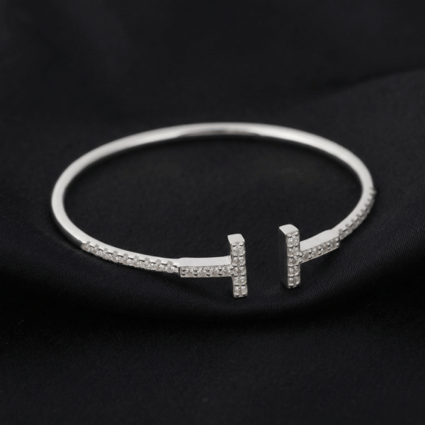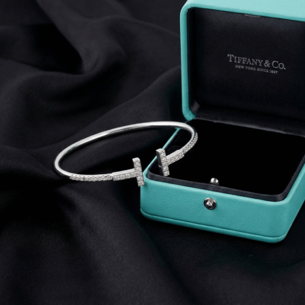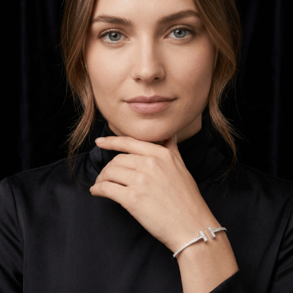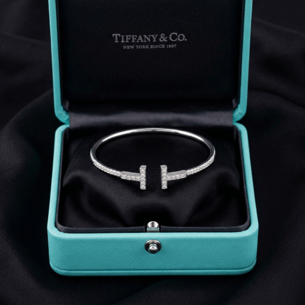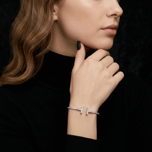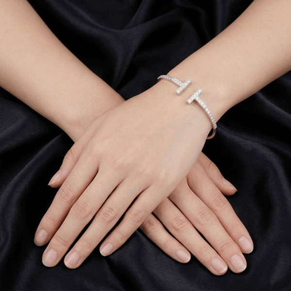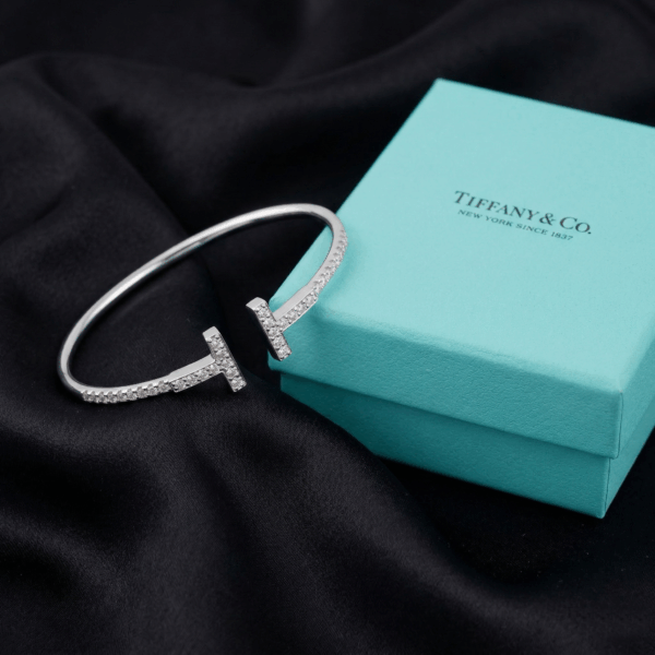 Chiếc lắc tay đến từ Tiffany & Co. mang thiết kế đặc trưng với biểu tượng “T” đôi đối xứng, đại diện cho sự tinh giản hiện đại và đẳng cấp vượt thời gian. Toàn bộ thân lắc được chế tác từ bạc cao cấp, đính đá lấp lánh tỉ mỉ theo từng đường nét, tạo nên vẻ ngoài sang trọng nhưng vẫn nhẹ nhàng, thanh lịch.