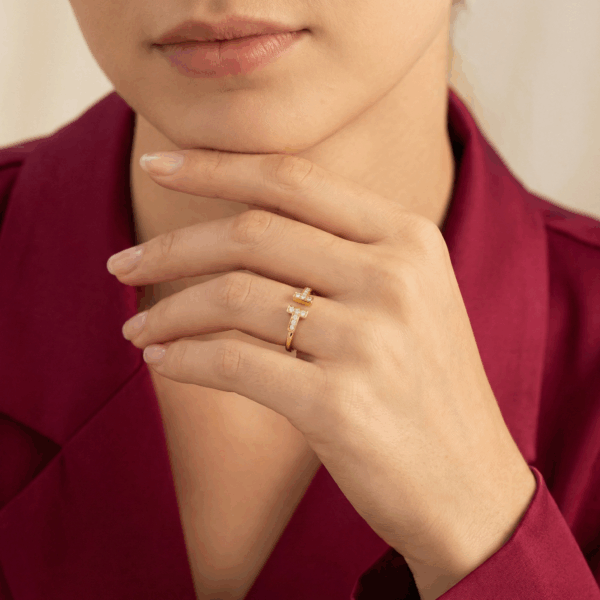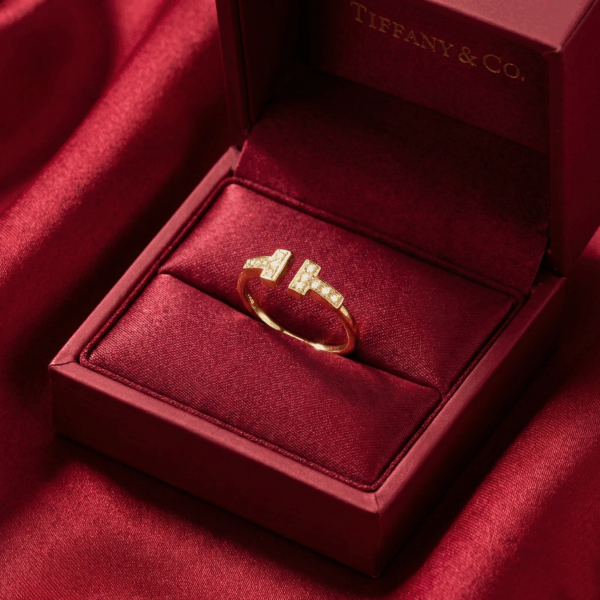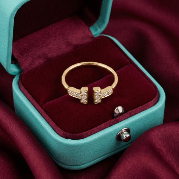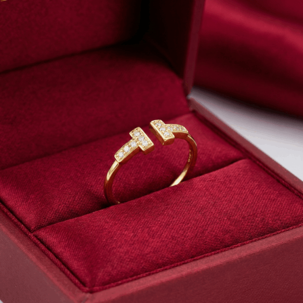 Chiếc nhẫn Tiffany T Wire Ring này nổi bật với thiết kế chữ “T” độc đáo, mang phong cách hiện đại và thanh lịch. Hai thanh chữ “T” được đính đá cubic zirconia lấp lánh, tạo điểm nhấn rực rỡ trên thân nhẫn mảnh mai, mang lại cảm giác nhẹ nhàng nhưng không kém phần sang trọng.