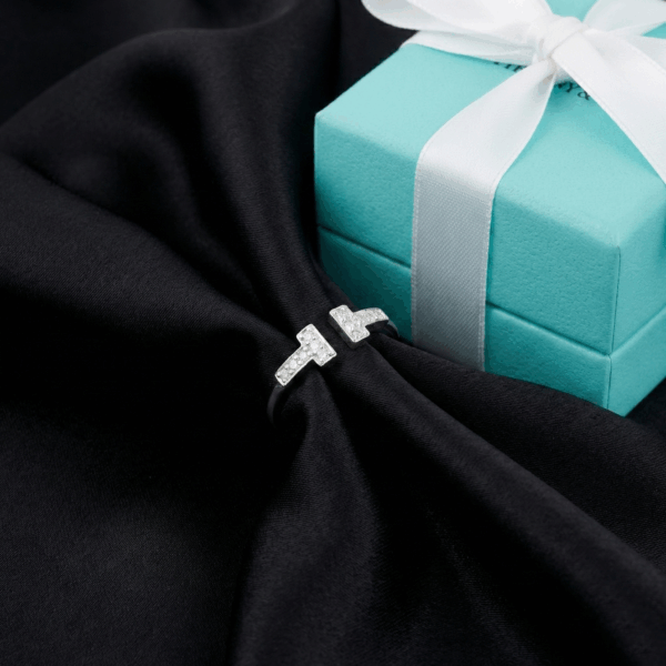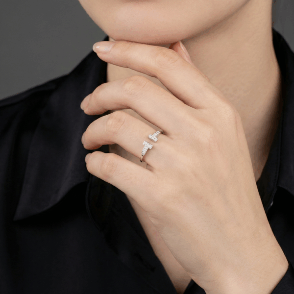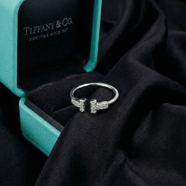Chiếc nhẫn Tiffany T Wire Ring này nổi bật với thiết kế chữ “T” độc đáo, mang phong cách hiện đại và thanh lịch. Hai thanh chữ “T” được đính đá cubic zirconia lấp lánh, tạo điểm nhấn rực rỡ trên thân nhẫn mảnh mai, mang lại cảm giác nhẹ nhàng nhưng không kém phần sang trọng.