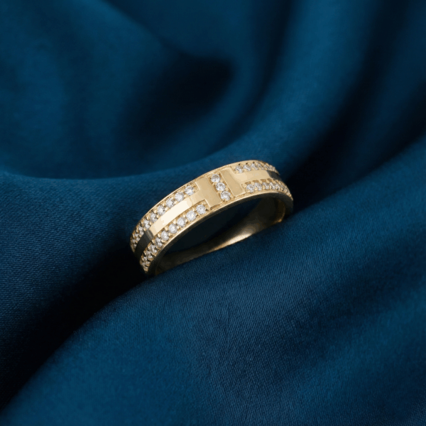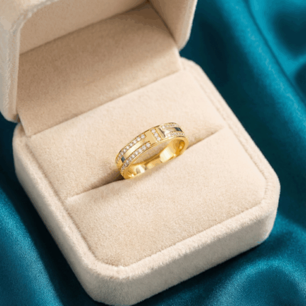 Thiết kế: Chữ “T” đính đá, thân nhẫn đính hai hàng đá lấp lánh