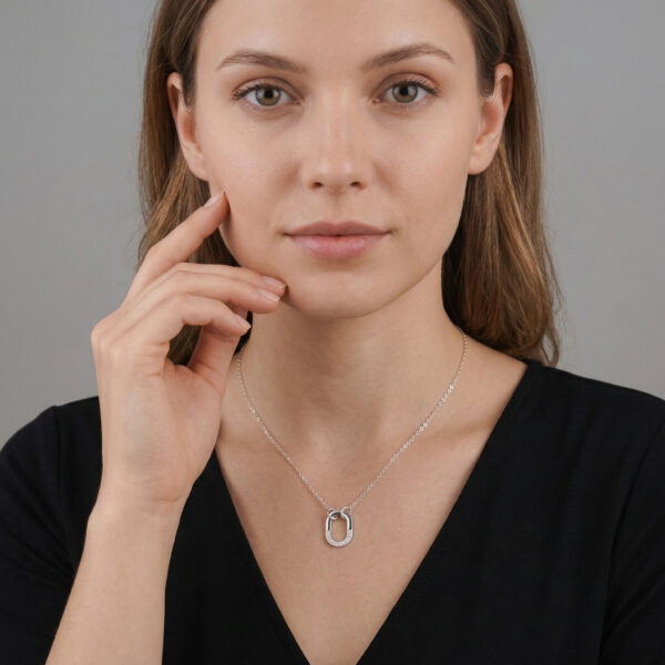 Điểm nhấn của sản phẩm là mặt dây chuyền hình chữ “O” được chế tác tinh xảo, với phần trên được đính một hàng đá cubic zirconia lấp lánh, mang lại vẻ sang trọng và cuốn hút. Bề mặt được đánh bóng mịn màng của mặt dây kết hợp hài hòa với dây chuyền bạc nhẹ, bền bỉ, đảm bảo sự thoải mái và phong cách suốt cả ngày dài.