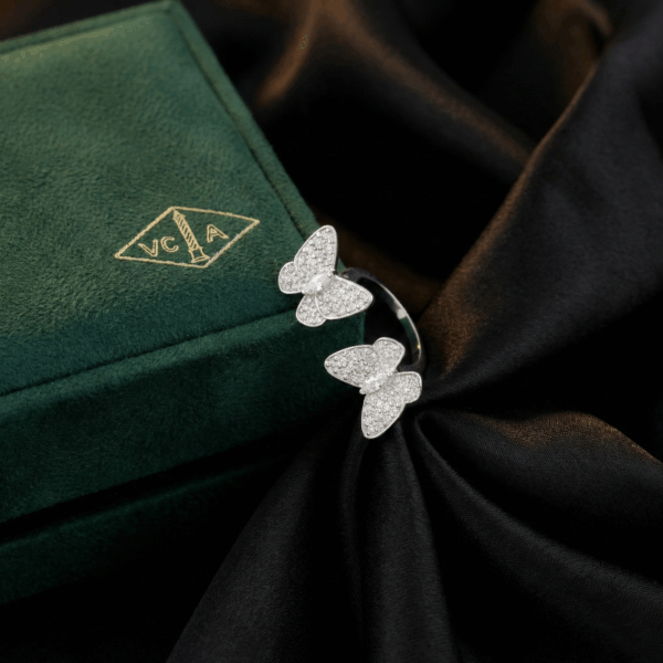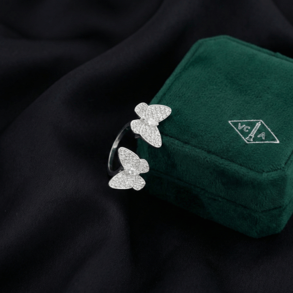 Nhẫn Two Butterfly Between the Finger Ring của Van Cleef & Arpels là một tuyệt phẩm nghệ thuật, mang đậm dấu ấn tinh tế và lãng mạn của thương hiệu. Thiết kế nổi bật với hai chú bướm nhỏ được chế tác tinh xảo, mỗi cánh bướm đính đầy đá quý lấp lánh, tạo hiệu ứng ánh sáng rực rỡ và sống động. Mỗi cánh bướm được đính kín những viên đá cubic zirconia lấp lánh, tạo hiệu ứng ánh sáng rực rỡ, thu hút mọi ánh nhìn.