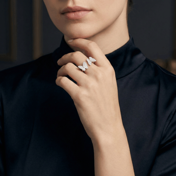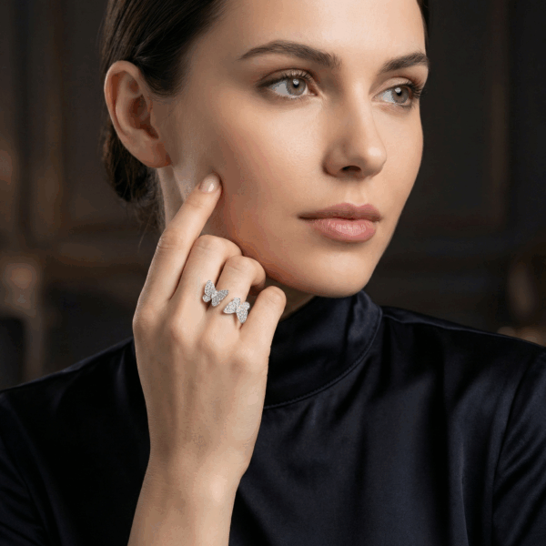Cảm giác đeo nhẫn này giống như đang mang cả một câu chuyện cổ tích. Hai cánh bướm như chạm vào nhau giữa hai ngón tay. Vừa nữ tính, vừa sang chảnh.