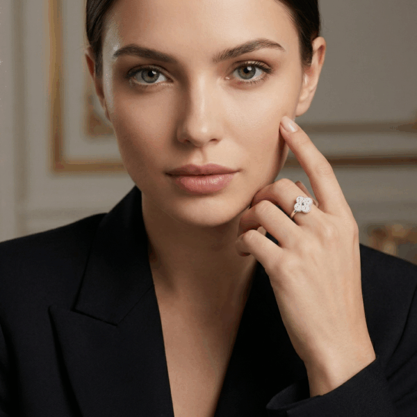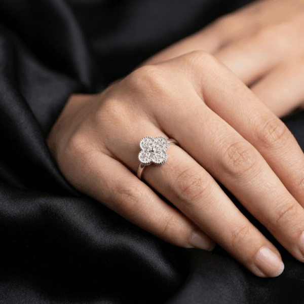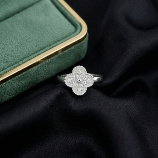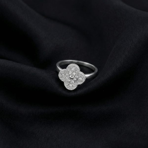 Chất liệu bạc 925 không chỉ bền bỉ, giữ được độ sáng bóng lâu dài mà còn an toàn cho mọi loại da, kể cả da nhạy cảm. Mỗi viên đá cubic zirconia được đính thủ công với độ chính xác cao, thể hiện kỹ thuật chế tác đỉnh cao và sự chú trọng đến từng chi tiết. Thiết kế hoa bốn cánh mang ý nghĩa may mắn và trường tồn, làm cho nhẫn không chỉ là một món trang sức mà còn là biểu tượng của sự tinh tế và ý nghĩa sâu sắc.