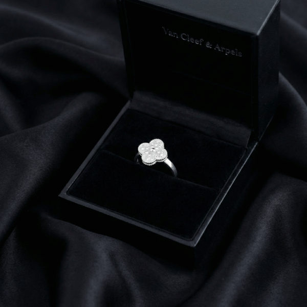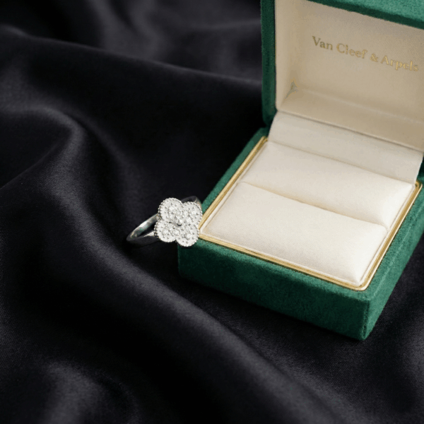 Chiếc nhẫn Vintage Flower của thương hiệu Van Cleef & Arpels là hiện thân của vẻ đẹp tự nhiên và sự thanh lịch, lấy cảm hứng từ những cánh hoa xinh đẹp tạo nên thiết kế hình hoa bốn cánh đầy tinh tế. Mỗi cánh hoa được đính kín đá cubic zirconia lấp lánh, tạo nên vẻ rực rỡ và cuốn hút.